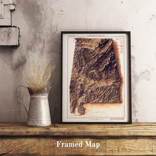 Alabama (USA) Shaded Relief Map | Vintage Elevation Map Based on 1925 Original
