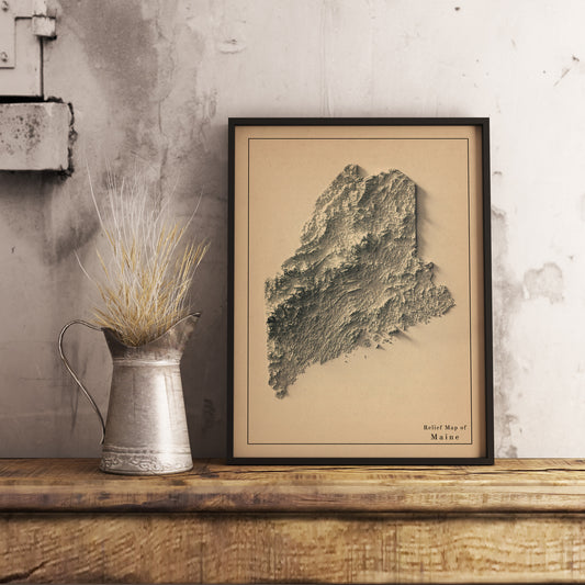 Maine (USA) Shaded Relief Map | Vintage Elevation Map Based on 1980 Original