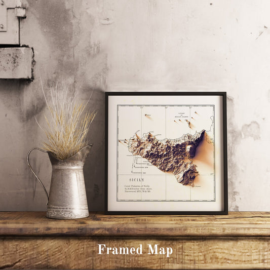 Sicily (Italy) Shaded Relief Map | Vintage Elevation Map Based on 1880 Original
