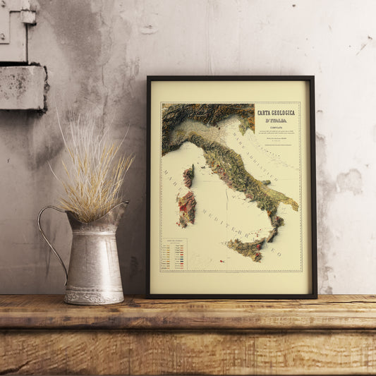 Italy Geological Shaded Relief Map | Vintage Elevation Map Based on 1880 Original
