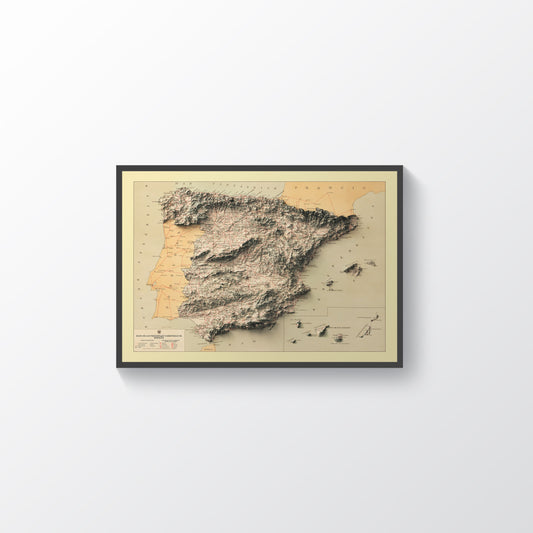 Spain Shaded Relief Map | Vintage Elevation Map Based on 1950 Original