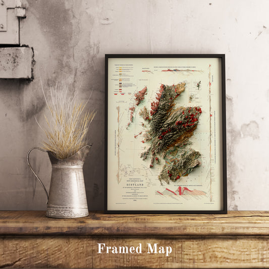 Scotland Geological Shaded Relief Map | Vintage Elevation Map Based on 1865 Original